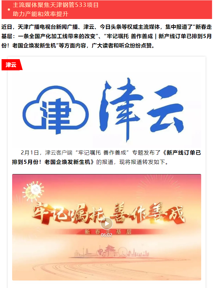 媒体聚焦 | 主流媒体聚焦天津钢管533项目 助力产能和效率提升