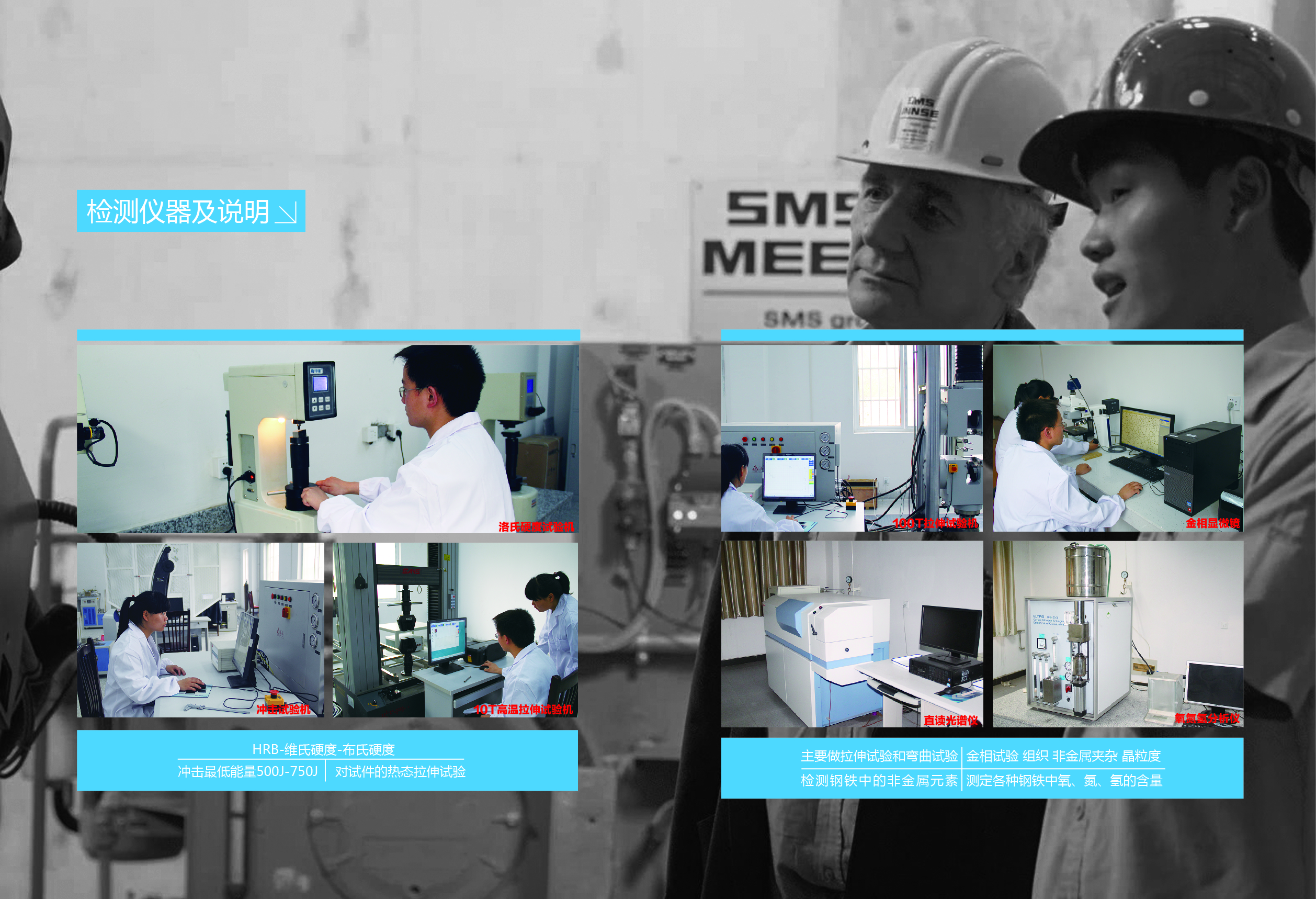 主要设备包括100t拉伸试验机,金相显微镜,氧氮氢分析仪,直读光谱仪,洛氏硬度试验机等
